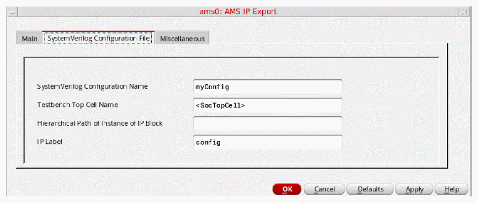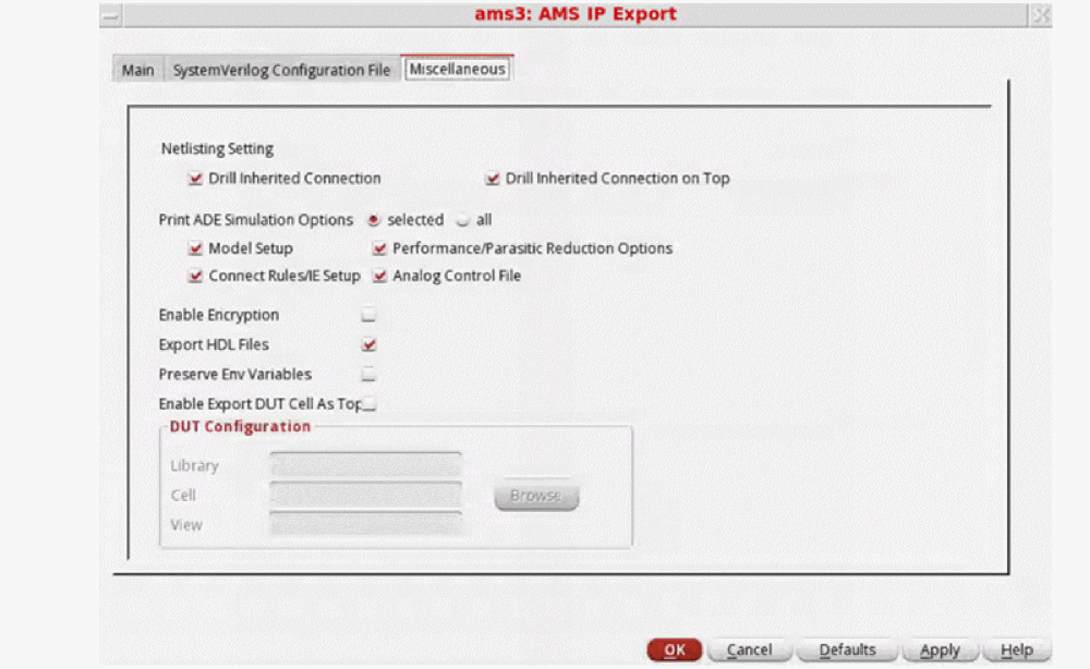 config_wrealto create a netlist and exports the design configuration into a portable run directory using the IP export option-export. While setting this command, it is assumed that the IP will be instantiated into the larger digital testbenchtb_dutat the hierarchical instance pathtb_dut.I1.I2and have all the bindings defined by a top level Verilog configuration calledmyTopConfig.runams -lib zambezi45_sim -cell pll_sim -view config_wreal -netlist all -clean -cdslib /home/user1/cds.lib -rundir /home/user1/runams_export_rundir -export -ipselectsimopt all -testbenchtopcell tb_dut -iphierpathtoiptopcell tb_dut.I1.I2 -iplabel config_function -v2001configname myTopConfig -log runams_export.log