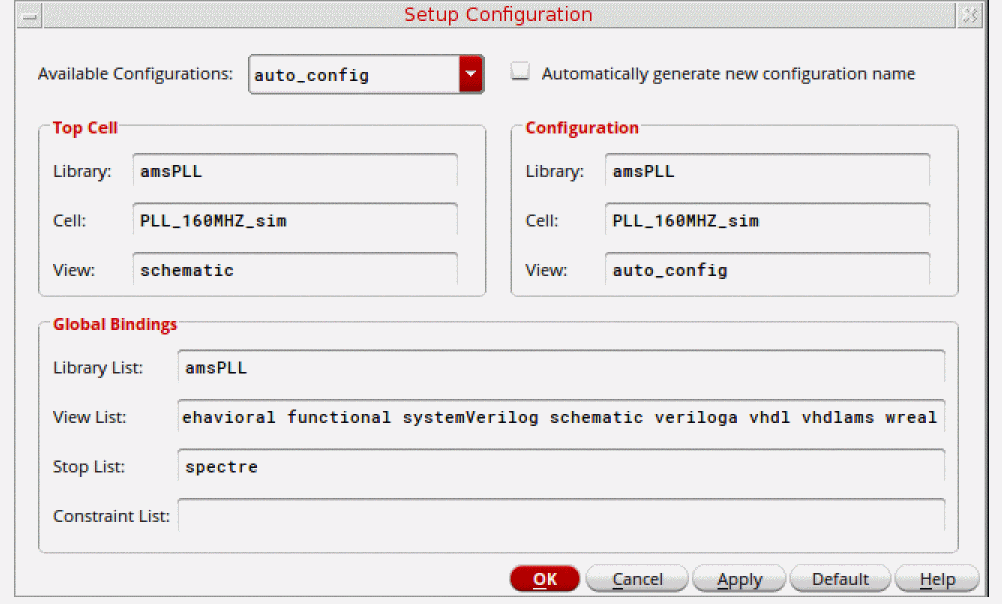Auto Create Configuration—Creates a new config cellview automatically. By default, the name of this new config cellview is