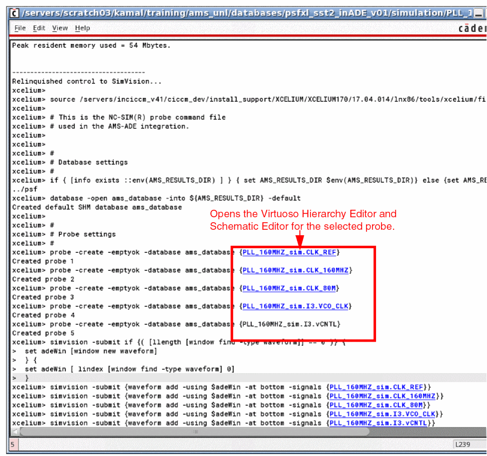 ADE Explorer sends Tcl commands to SimVision for the simulation run and to plot the signals listed in the outputs pane. This mode lets you control xmsim and simvision from the console window.