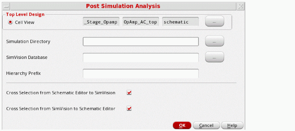 In the SimVision menu, click Cross Selection. The Post Simulation Analysis form is displayed.