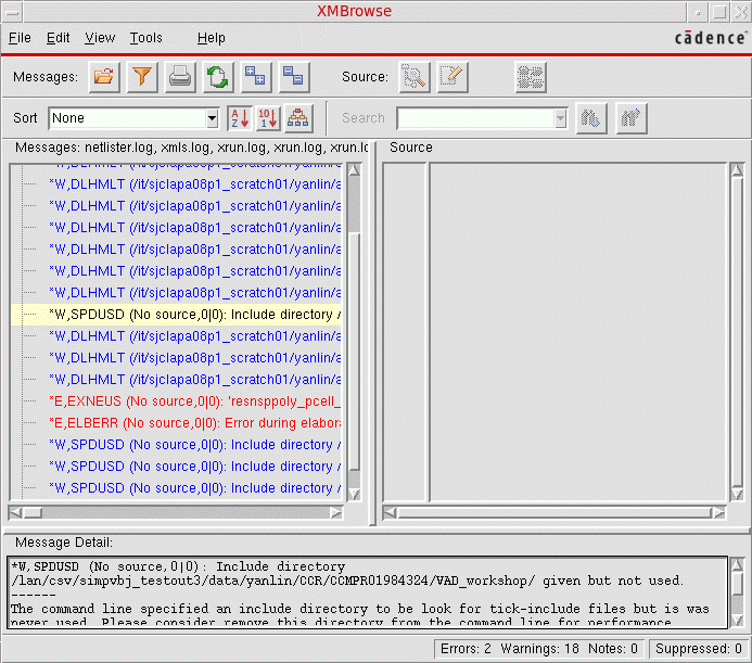 You can view the output logs (netlister.log and xrun.log) from the Simulation – Output Log submenu. Choose Output Log – LogFile Utility to launch the XMBrowse message browser.