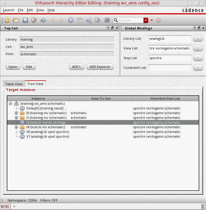 All design instances and their cell bindings appear in the Virtuoso Hierarchy Editor window. - (Optional) In the Global Bindings group box, you can type directly in the fields to edit the lists as required. For example, VHDL users might want to add a wildcard asterisk to View List.