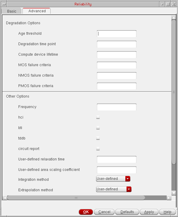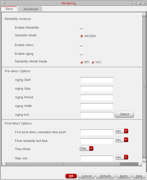 To set up the reliability analysis options, choose Simulation – Reliability – Setup. The form appears. When you select HSPICE as simulator, the form displays two tabs – Basic and Advanced.
