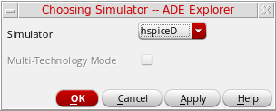 To set hspiceD, choose Setup – Simulator. The Choosing Simulator -- ADE Explorer form appears. Select hspiceD simulator in this form.