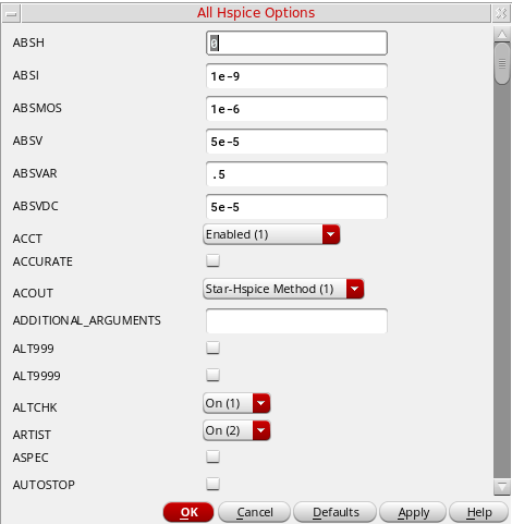 - Click DC Analysis Options – Accuracy Options to specify ABSH, ABSI, ABSMOS, ABSVDC, DI, KCLTEST, MAXAMP, RELH, RELI, RELMOS, RELV, RELVDC using the Hspice DC Accuracy Options form.
