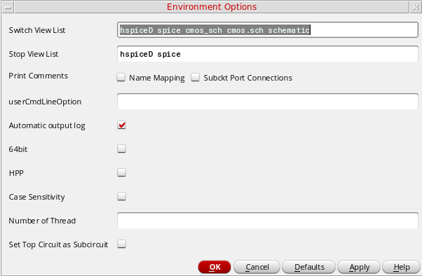 - Click Model Analysis Options – Mosfet Control Options to specify CVTOL, DEFAD, DEFAS, DEFEL, DEFNRD, DEFNRS, DEFPD, DEFPS, DEFW, SCALM, WL using the Hspice Mosfet Control Options form.