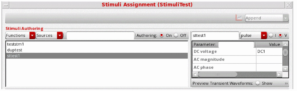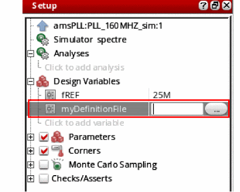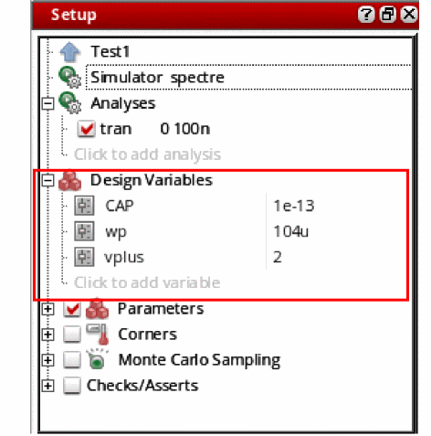 ADE Explorer contains a single test and the test name is displayed at the top of the Setup assistant. This assistant displays the setup information for the test, such as simulator, analysis, design variables, parameters, corners, Monte Carlo. By default, the test name includes the design information in the lib:cell:view format. To change the test name: