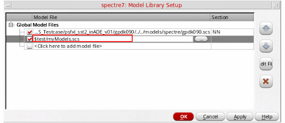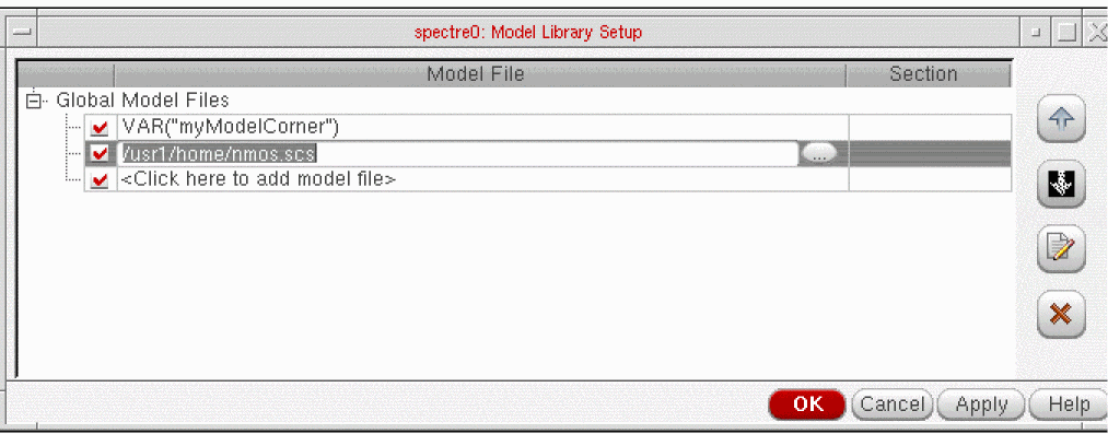 Alternatively, you can click the browse button to select a valid model file.Alternatively, you can click the browse button to select the model library files to be added. - (Optional) In the Section column, select a section from the drop-down list.