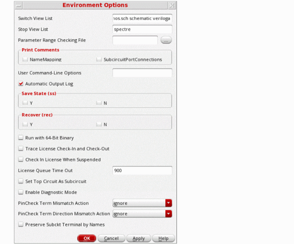 spectre,hspiceD,ultraSim, andams.When you switch from one simulator to another, a new oasis session is created. The new simulator retains the setup files recognized by it and ignores the rest. This behavior is controlled by retainStateSettings environment variable with the default value “yes”. On setting this variable to “no”, the new simulator does not retain the setup files from the previous oasis session.