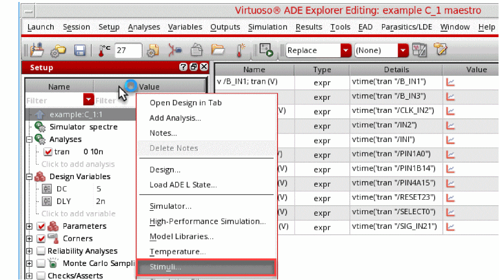 Alternatively, you can use a text editor to create an OCEAN script by using OCEAN commands and save it in a.ocnfile.For a single point run, ADE Explorer can run multiple simulations simultaneously using different OCEAN sessions.The spectreFormatter and associated methods are defined in the spectreinl context. This does not get loaded automatically by asiGetTool(’spectre). To load relevant contexts, you need to edit your code by adding spectreinl to the list of contexts it loads. This is illustrated in the following example:; Need to have these contexts loaded - in the right order ; - so that that the spectreFormatter class can be extended