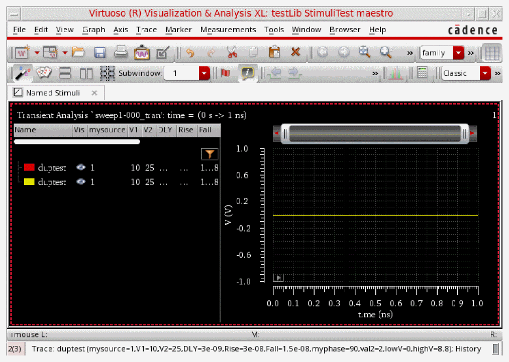 The Virtuoso ADE Explorer lets you can run different simulations for a given design. You choose a simulator and the types of analyses you want to run for the design. You can also specify design variables that you want to use for simulations. When you run simulation, the results are saved in a predefined formats and can be used by other tools, such as the Virtuoso Visualization and Analysis XL for further analysis. If there are signals in the simulation results, they are by default plotted in the Virtuoso Visualization and Analysis XL graph window.