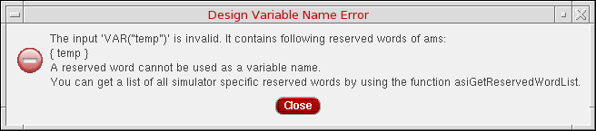Each simulator has reserved words you cannot use as names for design variables or passed parameters of a subcircuit (use in a pPar expression):