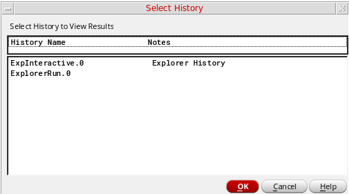 The Select History form appears. In this form, in the History Name column, select the history you want to view the results for. Any notes added for a history item are displayed in the Notes column.If no history is available in the current session, the Result – Select option is disabled. If multiple histories are available, by default the first history is selected in the history list.