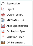 The outputs of type—Expression, Signal, OCEAN Script, MATLAB Script, Area Specification, Violation Filter and OP Parameters—that are added in the Output Setup pane are called measurements. The following figure shows the list of outputs that can be saved or plotted after a simulation is complete: