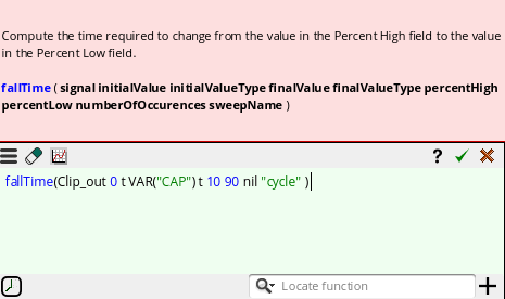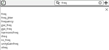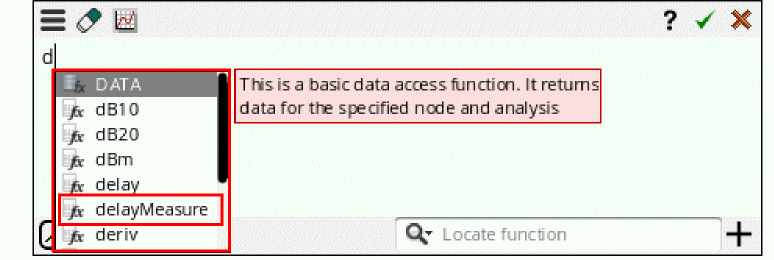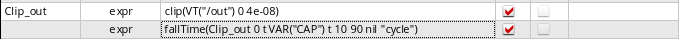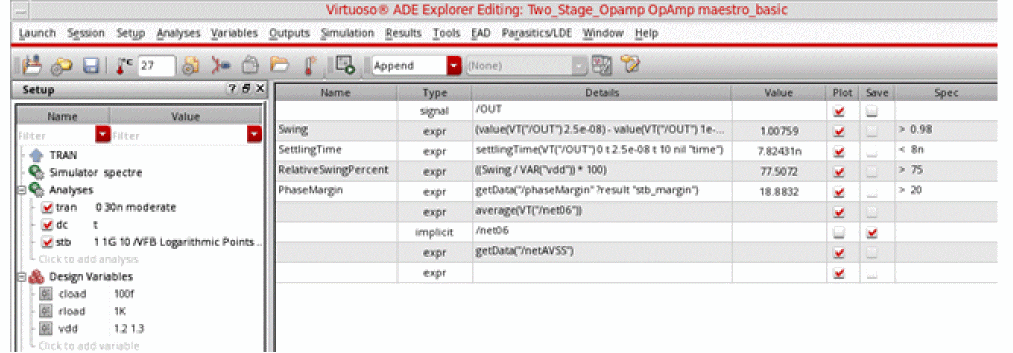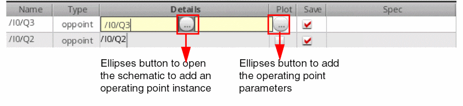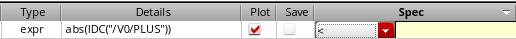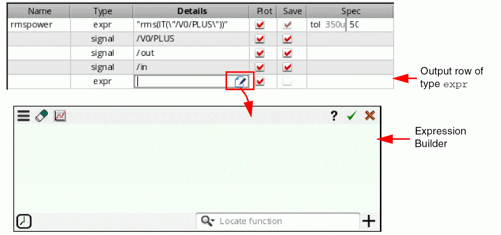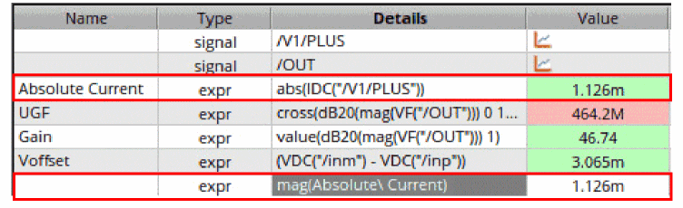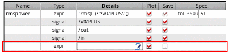 - In the Details column, either directly type an output expression or click the button to open Expression Builder to add an output expression. For example, you can build an expression for the 3 dB point of an output signal as follows: bandwidth(VF("/OUT), 3, "low"). For more information about how to build expressions using Expression Builder, see Creating Expression Outputs Using the Expression Builder.
