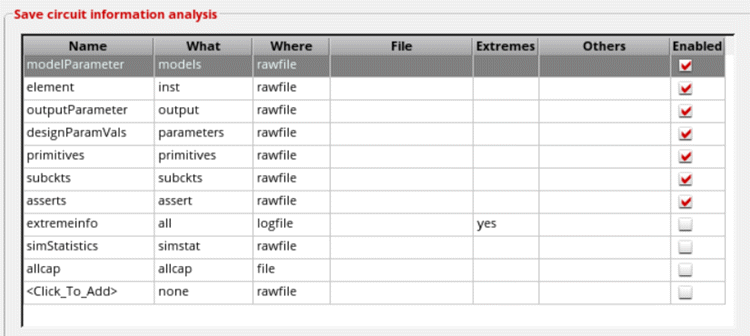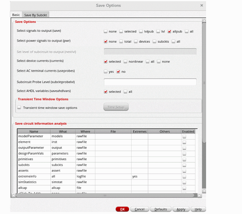 - all: saves all node voltages, subcircuit terminal currents and all available device information including terminal currents and operating point parameters. This is the default selection.