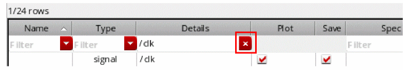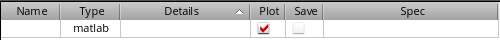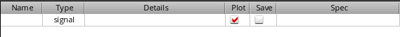 The selected output type is added in a new row in the Outputs Setup pane. For example, if you add an output of type signal, the following row appears in the Outputs Setup pane. The Plot check box is selected by default.