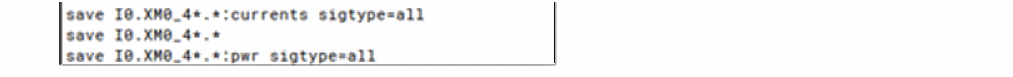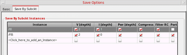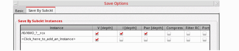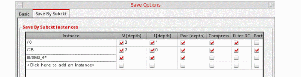 probe.tclfileThe Instance column in the Save By Subckt Instances table supports wildcards, which makes it easier to save the correct signals down the hierarchy. For example, to save only the voltage, current and power signals underI0/XM0_4add the syntaxI0/XM0_4*.The resultant netlist contains the following save statement: