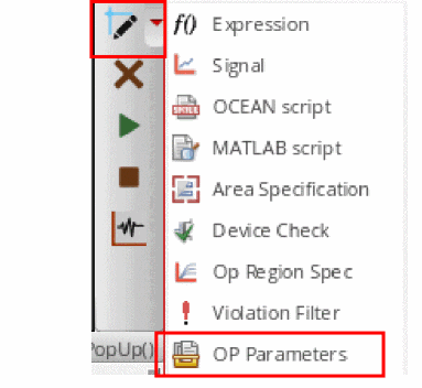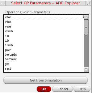 Select the Schematic Pcell OP Parameters to be Saved check box. You can either type the names of the OP parameters in the text box, or click Select to choose the operating point parameters of the specified Pcell from the schematic. When you choose from schematic, the text box displays the selected operating points as