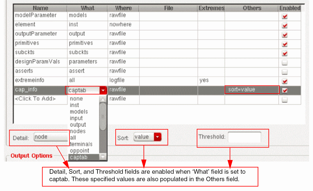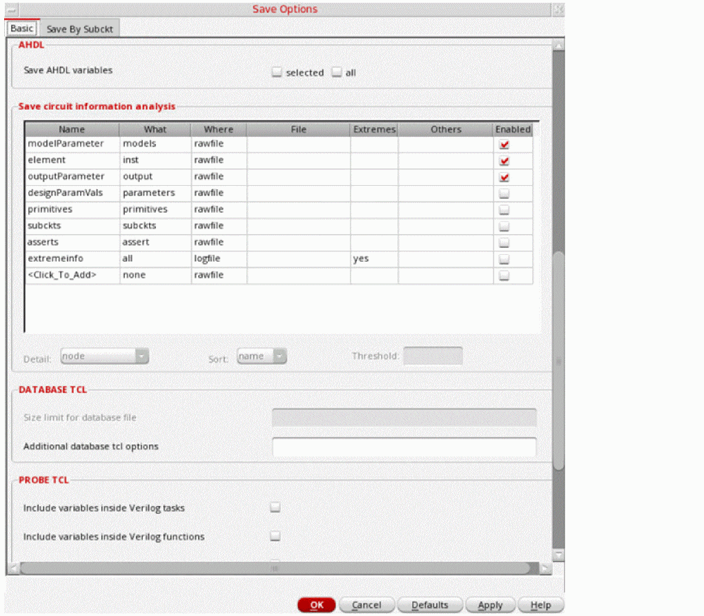 The available options are- node: saves node voltages for all instances of the specified subcircuit.