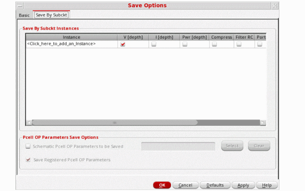 The Save By Subckt tab on the Save Options form is used to manage Subckt instances and Pcell.