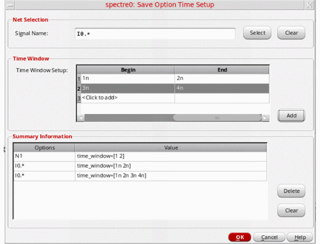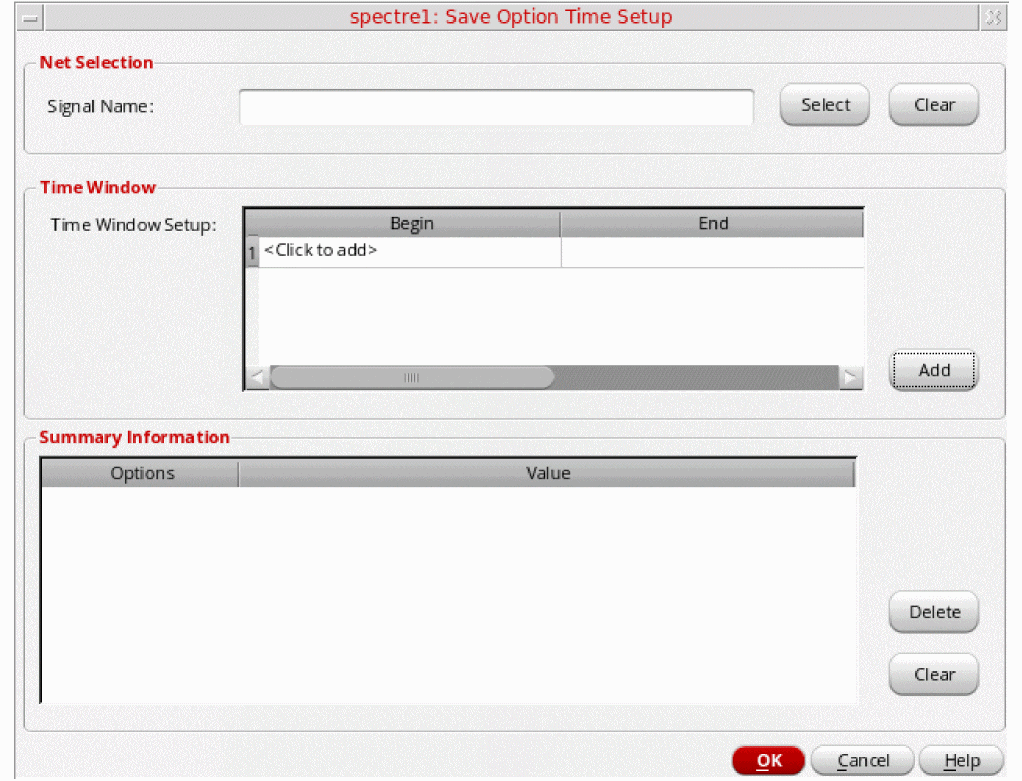 Summary Information — Used to display the summary of the signals and their corresponding time windows. Click Delete to remove the time window details for the specified node or signal from the netlist. Click Clear to clear the Summary Information table.