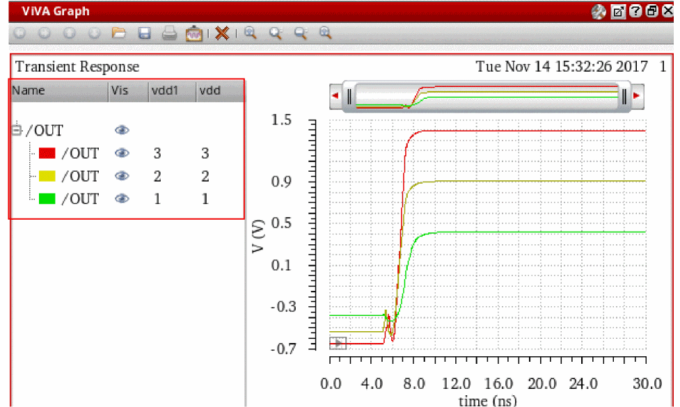 Now, if you run a simulation and plot the /OUT signal, the following waveforms are generated for the three values of vdd and vdd1, as shown in the figure below.