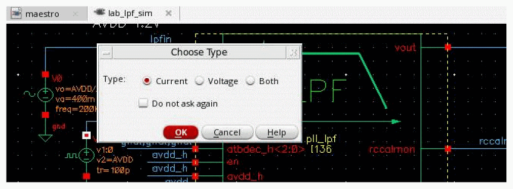 Alternatively, you can manually enter a signal. In this case, the type of data to be saved—current, voltage, or both— is decided through the terminal selection type specified in the Plotting/Printing Options form.By default, the current data is saved for all selected terminals. However, you can choose to save or plot voltage data, or both current and voltage. Alternatively, you can request for a prompt to check which type of data to be saved for all signal output selections. For this, set the terminalSelectionType environment variable.When the variable is set to "prompt", the following message prompt is displayed where you can select the type of data.