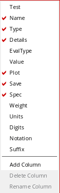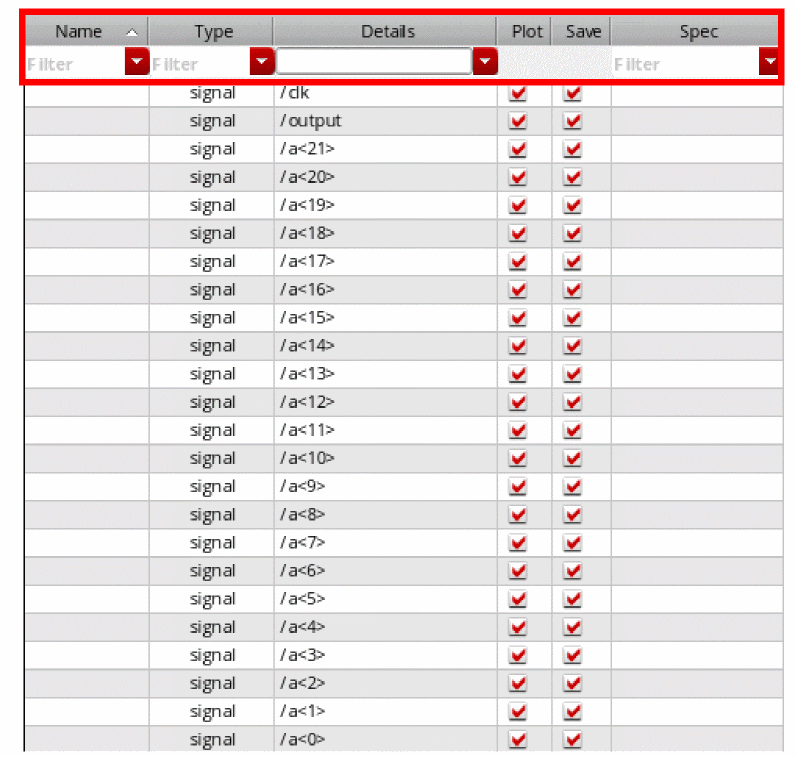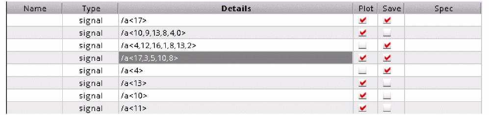 To add more columns to the Outputs Setup pane for expression, right-click anywhere in the header and choose the column you want to add from the context-menu. By default, Name, Type, Details, Plot, Save, and Spec columns are displayed.
