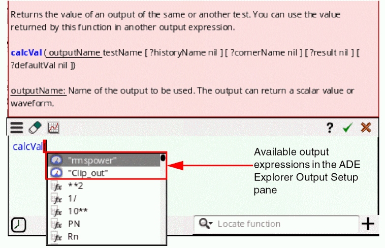 The Outputs Setup pane appears to the right of the ADE Explorer window. You can use the this pane to add a new output signal/expression/OCEAN or MATLAB script or to change an existing output. This pane is blank when no outputs are specified.