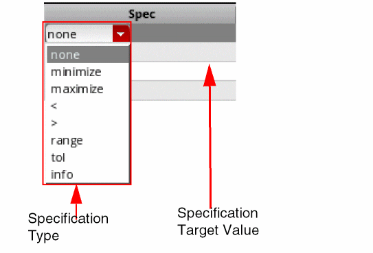 - In the Spec and Weight columns next to the expression, define the specification and the weighting factor for the specification for the output expression.