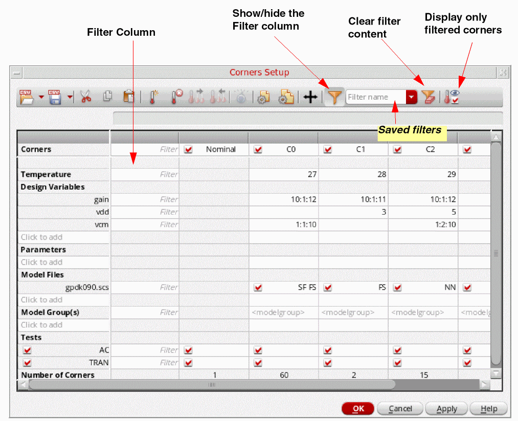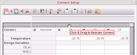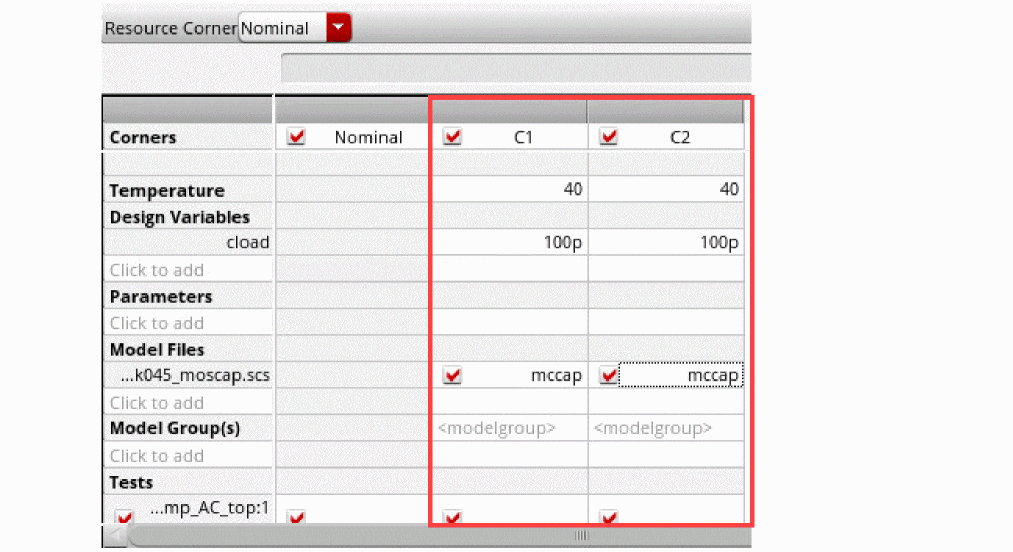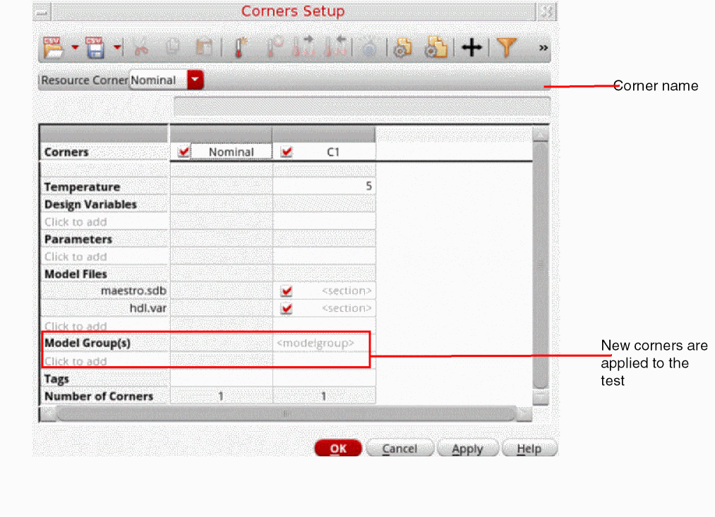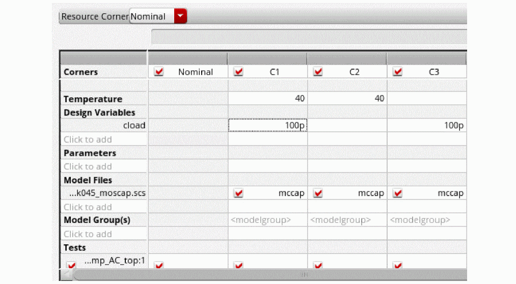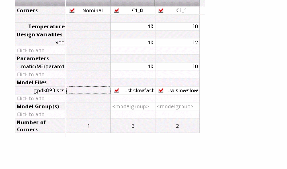 Each corner is added as a new column on this form. By default, the table contains a default corner, namedThe Corner Setup form contains the following:Nominal. This is the nominal corner and runs without varying the corners variables.-
