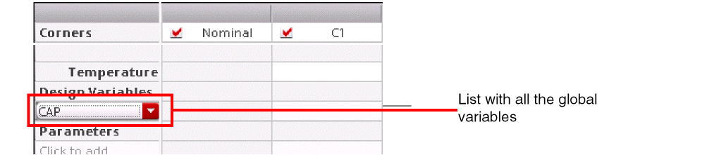 To specify the value for this variable, click in the cell corresponding to this variable in the column that contains the corner definition.