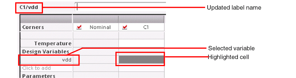 Variable editing text field — In this field, you can edit values for corner variables. The label to the left of this field changes dynamically to show the name of the corner and the variable that you are currently editing. For example, if you click in a cell that defines temperature for corner
