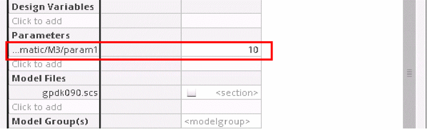 For a corner, you can specify parameters in the same way as you specify variables. When you click the text Click to add under Parameters, a drop-down list containing the names of all the CPF parameters, created for the cells or instances used in the test, is displayed. Select the required parameter from this list and specify a value for the parameter.