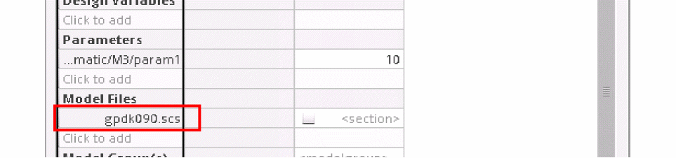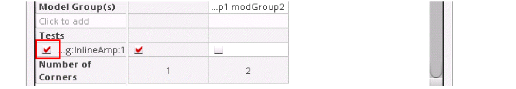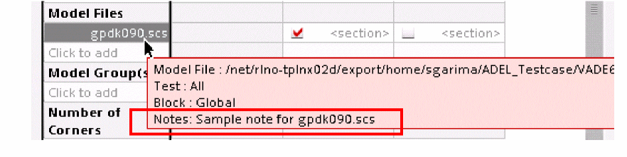 If required, you can specify a selected set of sections of the model file. For more details on how to specify sections for a model file, refer to Specifying Sections for Model Files.If you have imported model files, the tool does not import the corresponding section names to be used. In this case, while running the corner simulation for a test, the tool considers those sections of the model file that are specified for the test. However, if required, you can specify a different set of section names.