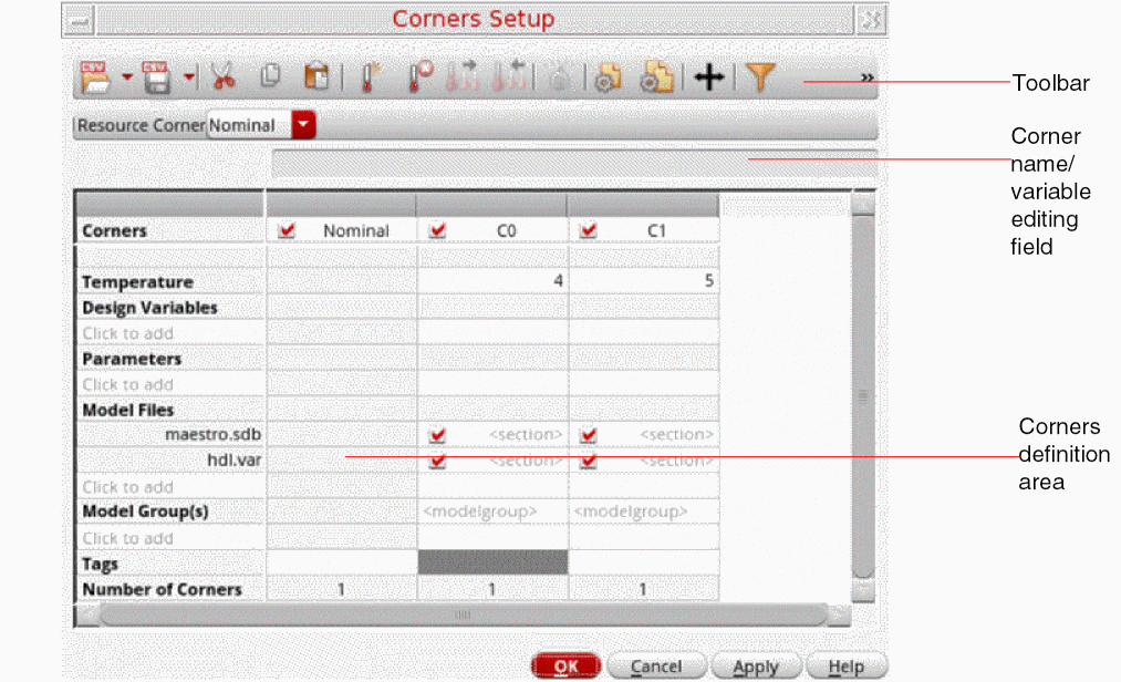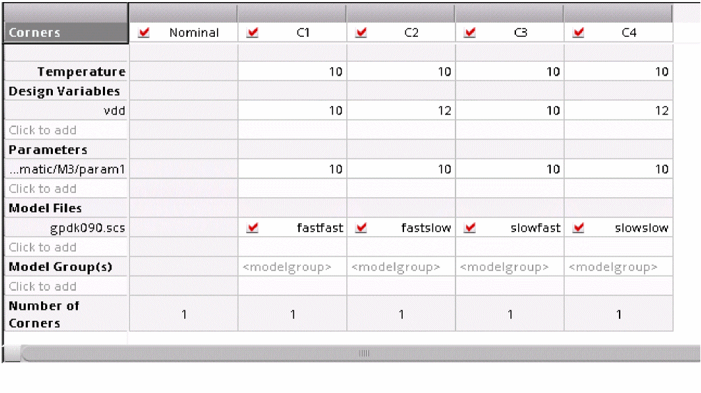 Corner definition area — Displays the corner definitions in a tabular format. The first column in the table lists the variables organized into various groups. Each subsequent column contains the definition of a corner where you can edit the values corresponding to these variables. When you add a corner, a new column is created for it. The top row in the table displays the corner names.