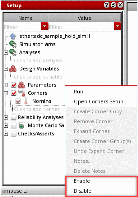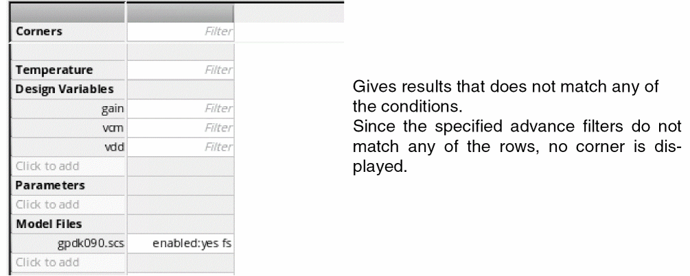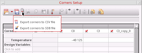 Remove Unselected: Removes the unselected variables.By default, before running a simulation, ADE Explorer does not match the design variables in the Corners Setup form with the list of global variables in the active setup. If the setup for corners uses any design variable that is not present in the active ADE Explorer setup, a redundant simulation is run for that variable. To ensure that any design variable that does not exist in the ADE Explorer setup is reported as an error before running a simulation, set the