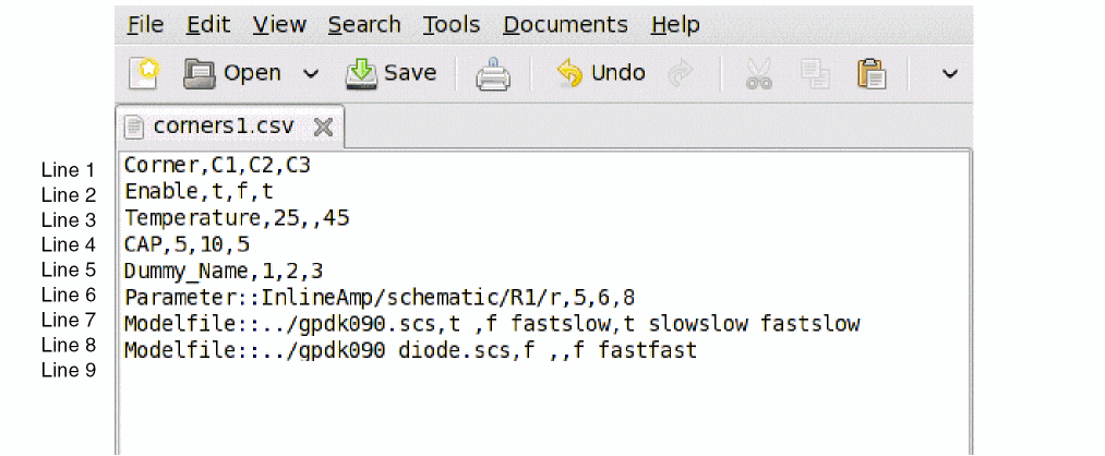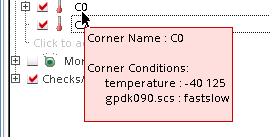 For example, if you expand a corner group that contains two variables such as Temperature=-40,27,125 and vdd=2,2.5,3, the total number of expanded corners for these values is nine. If the original corner name is C5 (for example), the expanded corner names are C5_0 through C5_8.
