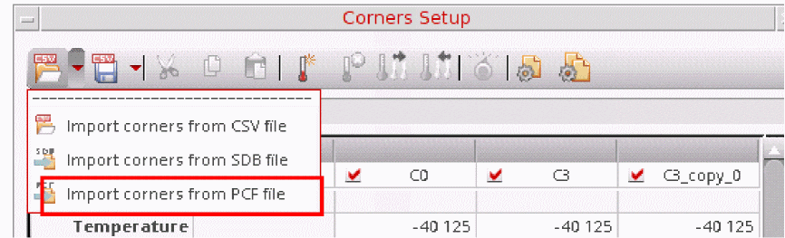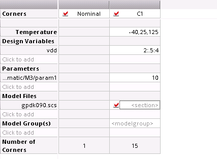 For example, for cornerC1in the following figure, a list of values (-40,25,125) is specified for theTemperatureparameter, and a range of values (2:.5:4) is specified for thevdddesign variable.