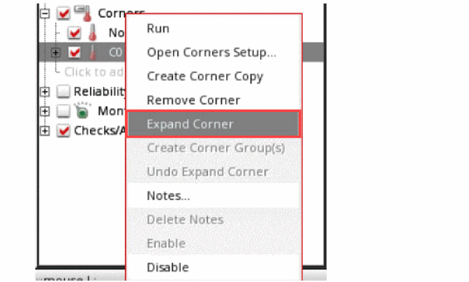 The corner group is expanded for all combinations of values of the selected parameters.To expand corners for value sets of the selected parameters, choose Expand Corner Selectively–Selected ParamSet. For example, in a corner group,C_temp_VDD, temp is varied for three values:-25,40and75.VDDis also varied for three values:1.8,2.0, and2.4. If you choose the Expand Corner Selectively–Selected ParamSet command, group1 will be expanded to create the following three corners: - C_temp_VDD_0 with temp =-25and VDD =1.8- C_temp_VDD_1 with temp =40and VDD =2.0- C_temp_VDD_2 with temp =75and VDD =2.4