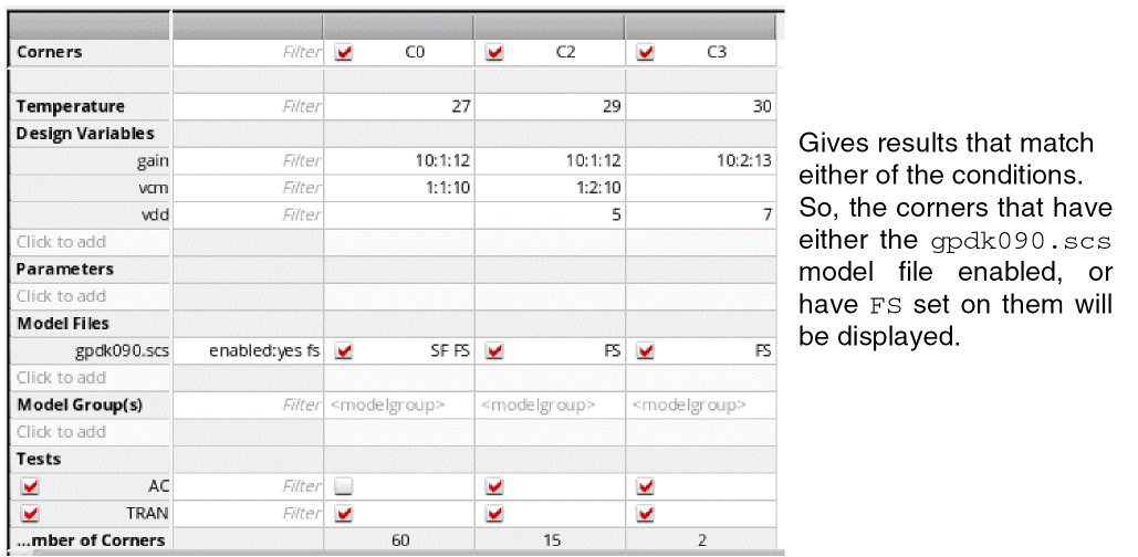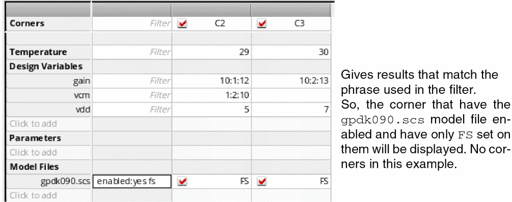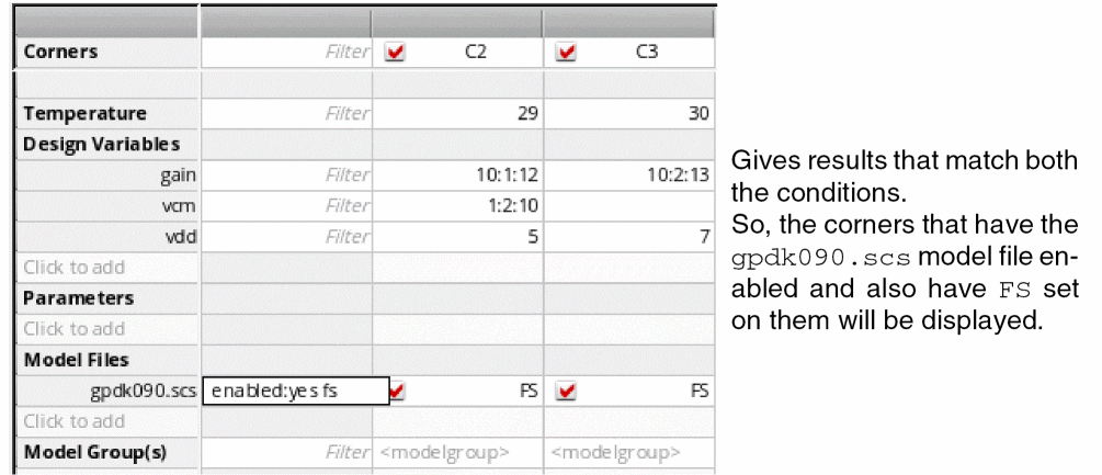 In the Corner Setup form, you want to filter the corners containing the gpdk090.scs model files with FS setting. To do so, apply a filter in the following format: