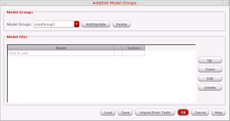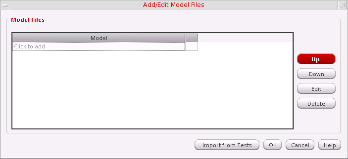 - Click Import from Tests. Model files are imported from the test and are displayed in the Model Files table. By default, the files appear enabled. You can disable a model file in a model group by clearing the check box to the left of the model file.