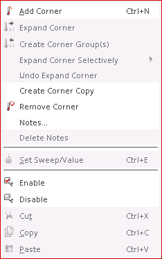 Context-sensitive menu — The most frequently used commands for corners are available in the context-sensitive menu of the Corners Setup form. When you right-click in a corner column, the following context-sensitive menu is displayed: