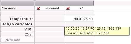 After adding a new corner, specify values for the variables that define the corner conditions.In a corner column, all the text fields, for example, Temperature or a Design Variable, are by default edited in the append mode. When you click a field and type a value, it is appended to the already existing value, if any. To replace the existing value, select and delete it and enter a new value.