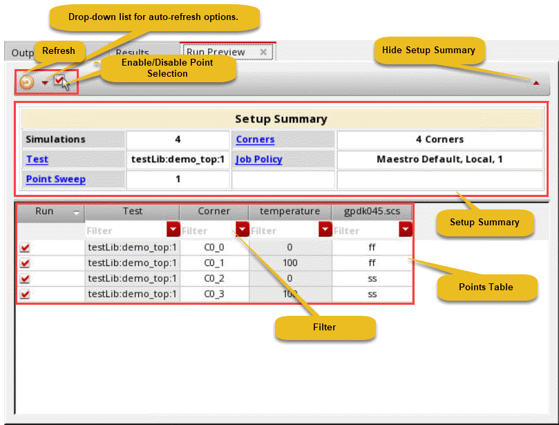 If you have selected the check boxes that enable automatic refresh of information, the details on the Run Preview tab show the updated corner and point details while you modify the ADE Explorer setup.