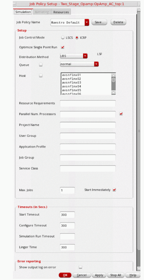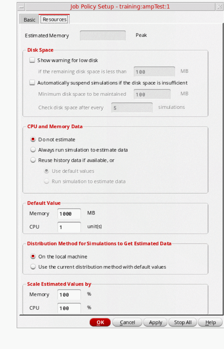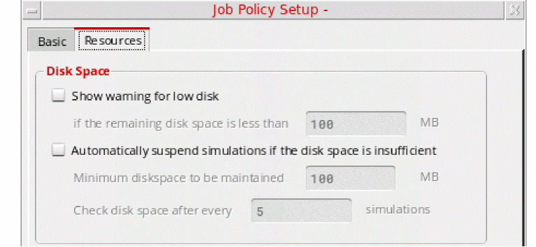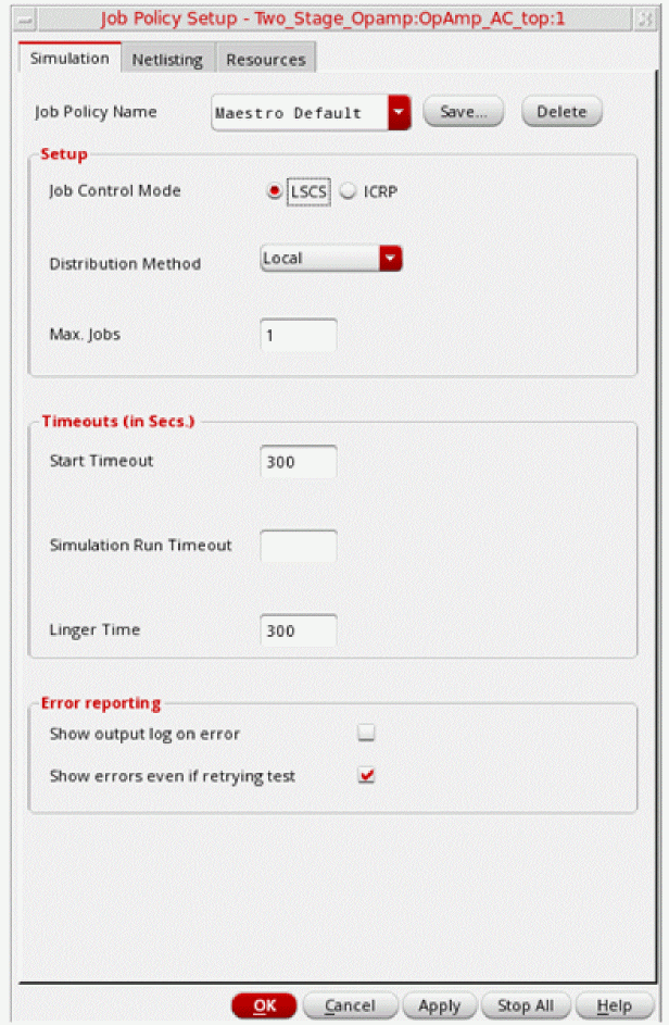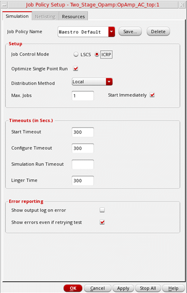 A job policy specifies the job control mode to be used to run simulations. In addition, it specifies the job distribution method: local, remote, or command; maximum number of jobs to be run at a time; and various job timeout settings.