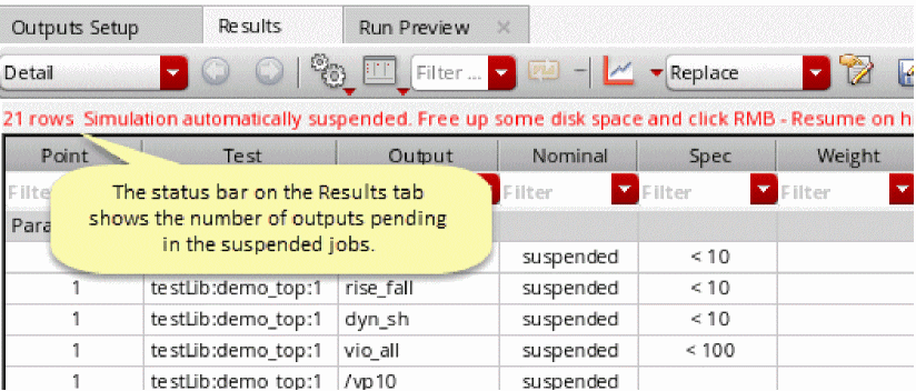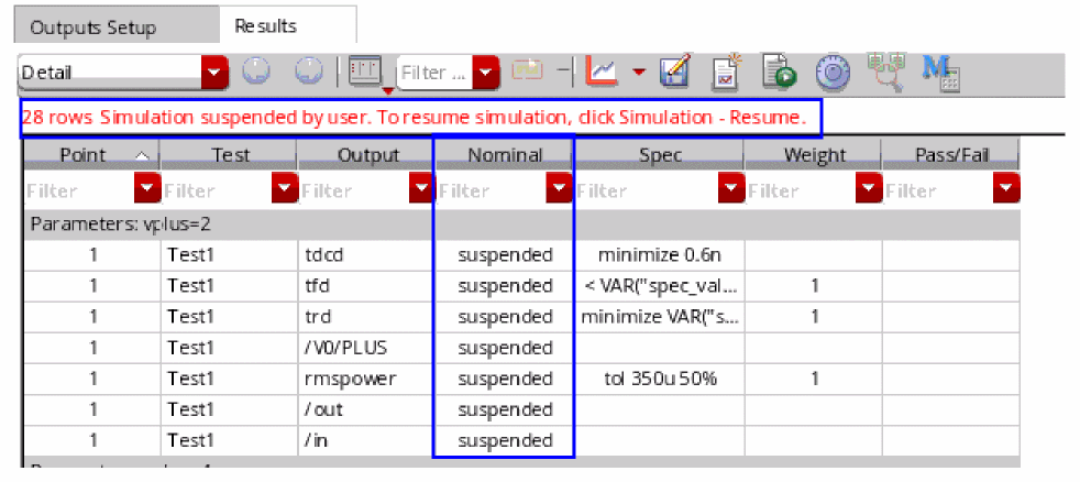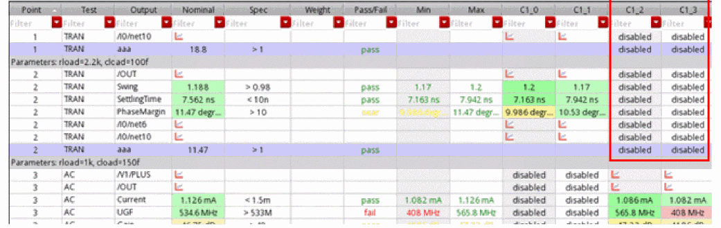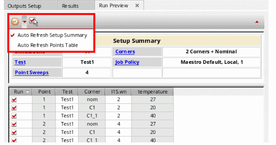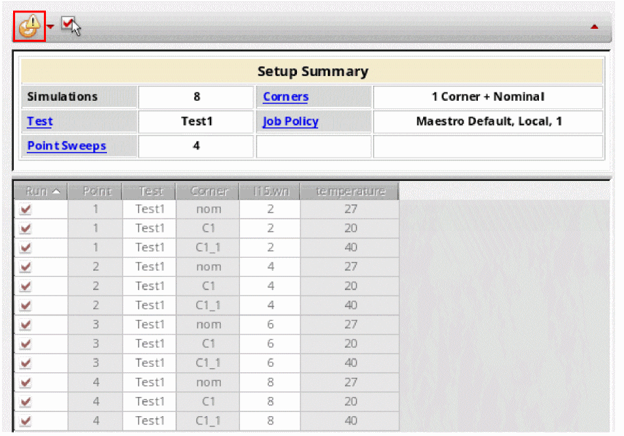 - Any setup changes in the variables, parameters or corners will reset the check boxes in Run column and select all of them.
