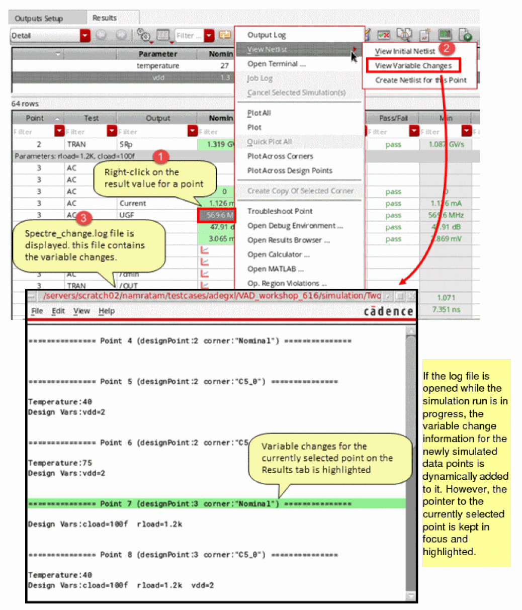 You can use the ADE Explorer Debug environment to load the setup of a data point you want to debug. The entire setup for the data point selected in ADE Explorer including the test, variables, and analyses details, corners, outputs, simulation settings, and job policy gets loaded. You can modify the settings for debugging purpose and perform all the tasks that you can perform in ADE Explorer such as running simulations and plotting results, except the following tasks: