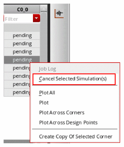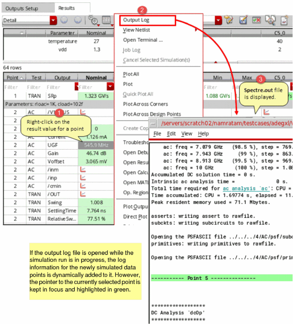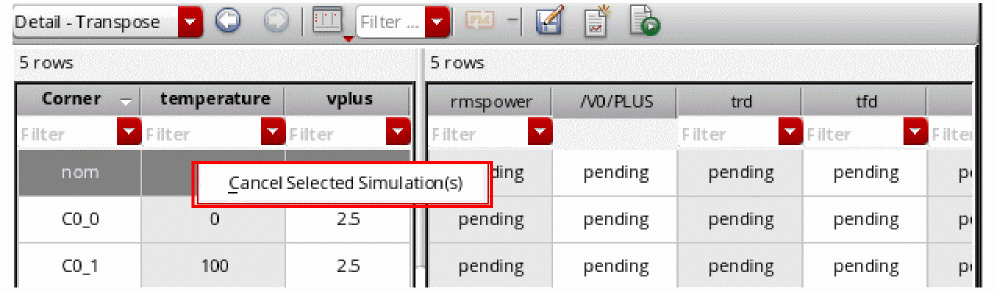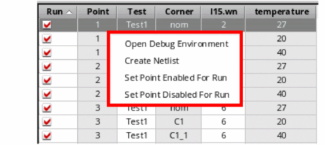 Before running a simulation for all the points, you might be interested in viewing the results of a specific design point and corner combination. In that case, you can run a simulation for only that combination and verify results. If required, make further modifications in the setup. To run a simulation for a specific design point and corner combination, right-click anywhere in the row corresponding to that combination and choose Open Debug Environment. ADE Explorer opens that simulation point in the ADE Debug Simulation Environment where you can run a simulation and view the results.